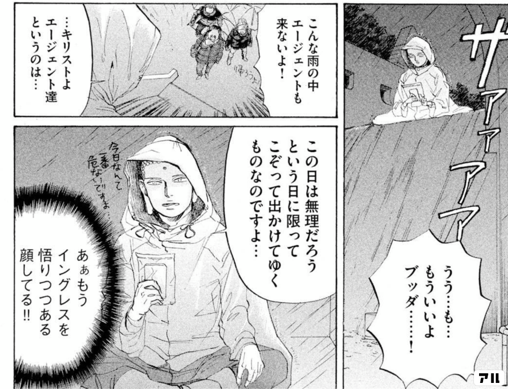 うう も もういいよブッダ こんな雨の中エージェントも来ないよ キリストよ エージェント達というのは この日は無理だろう という日に限ってこぞって出かけてゆくものなのですよ あぁもうイングレスを悟りつつある顔してる 聖 お